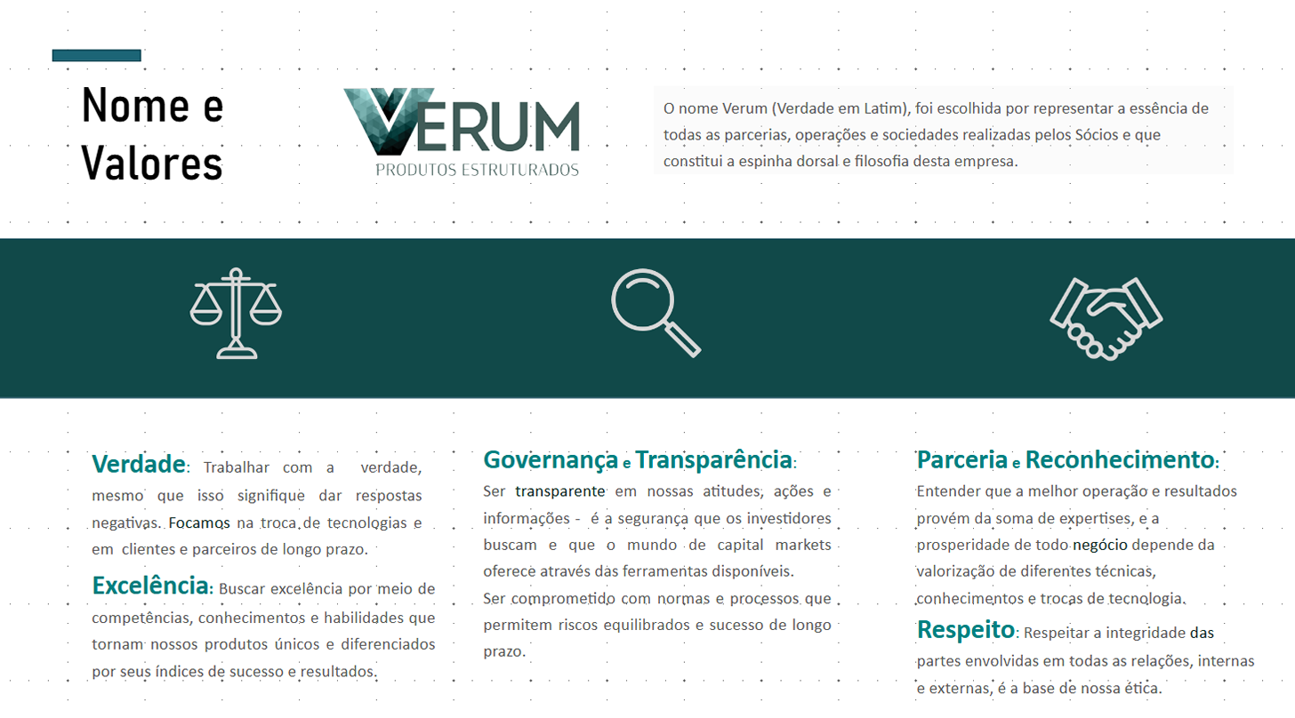 Com o expertise e ferramentas de mercado, e a flexibilidade e requeridos pela economia real, a VERUM entrega uma solução Taylor Made mais alinhada às expectativas de cada cliente, empresa, investidor e parceiro.