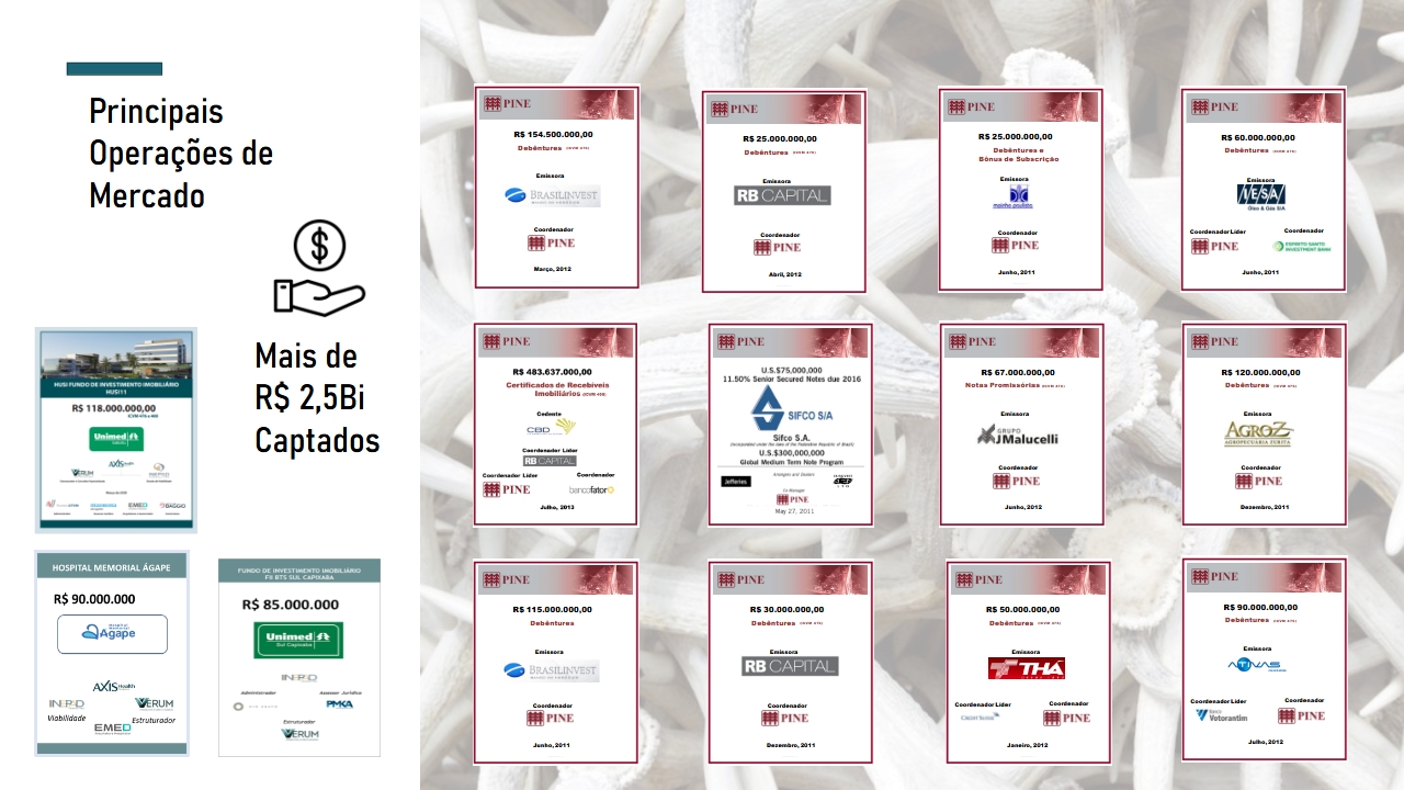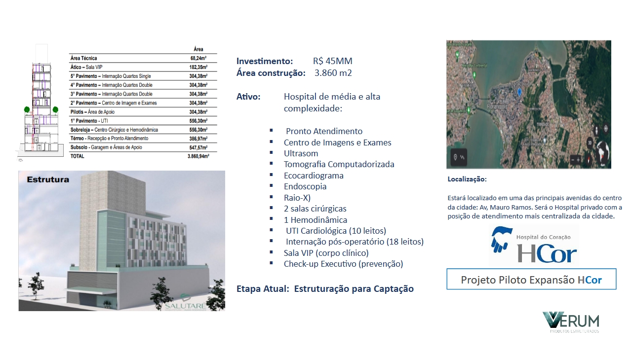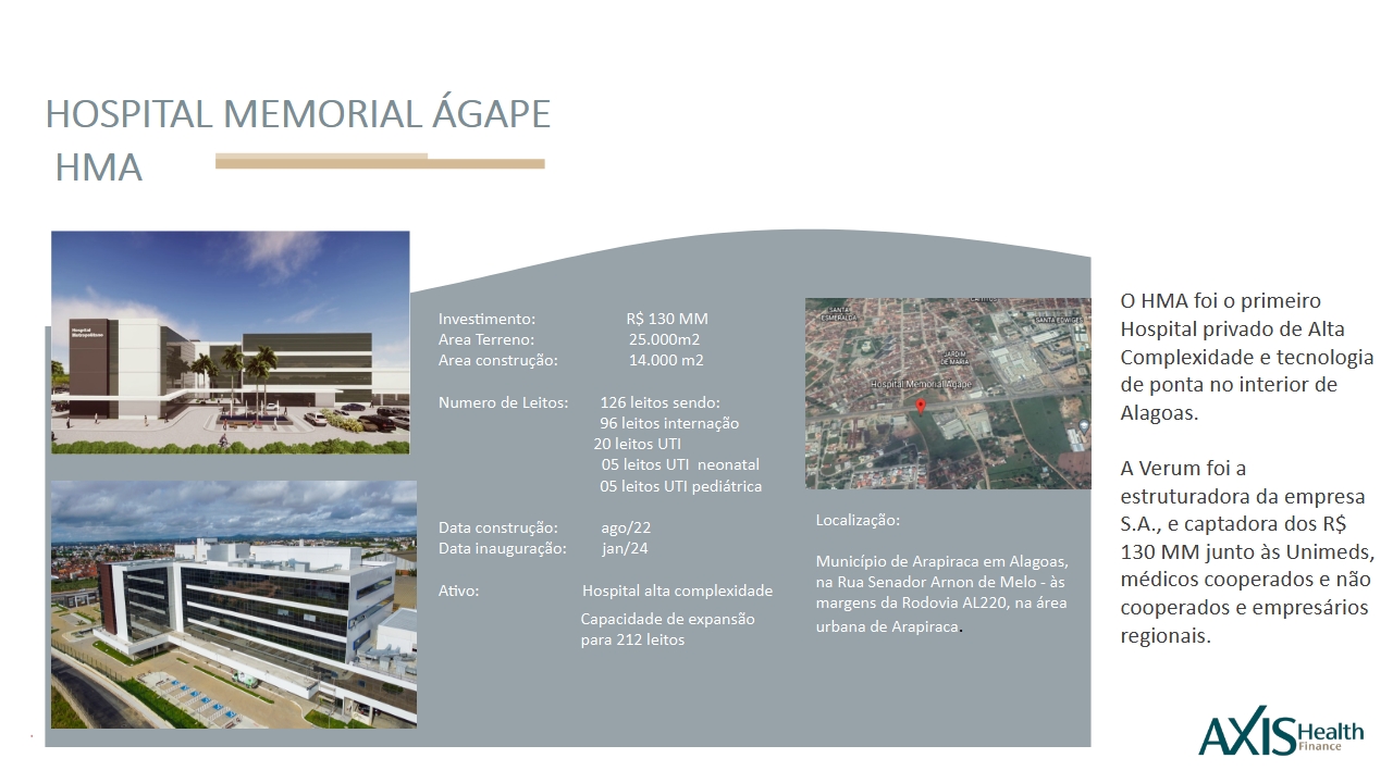 Modelagem de soluções e produtos financeiros para o desenvolvimento, expansão ou monetização de ativos na área de saúde, além da área de aquisição e locação de Equipamentos Hospitalares.